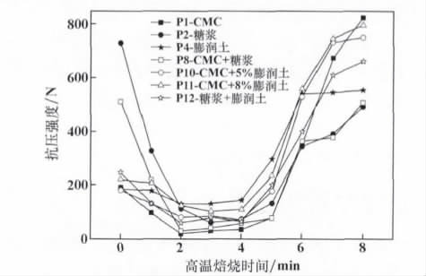 根據(jù)上述研究結(jié)果,選取強(qiáng)度符合要求的球團(tuán)P1、P2、P4、P8、P10、P11 及 P12 測(cè)定其高溫強(qiáng)度,其結(jié)果如圖 1 所示。不同配比粘結(jié)劑在高溫焙燒過(guò)程中強(qiáng)度變化趨勢(shì)基本一致,在焙燒初期球團(tuán)抗壓強(qiáng)度降低, 后期球團(tuán)強(qiáng)度又逐漸提高。