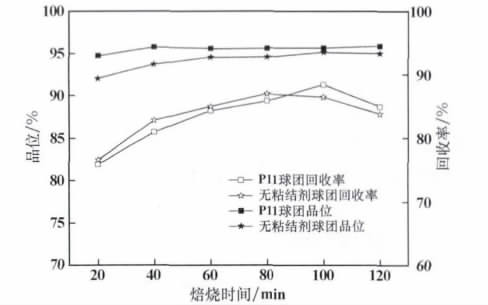 確定球團(tuán) P11 為優(yōu)選配方后,對(duì)其進(jìn)行直接還原焙燒-磁選試驗(yàn)。無(wú)粘結(jié)劑球團(tuán)作為對(duì)照試驗(yàn),考察粘結(jié)劑對(duì)球團(tuán)直接還原焙燒磁選的影響。從圖3 可以看出,兩種球團(tuán)隨焙燒時(shí)間的變化趨勢(shì)基本一致,隨著焙燒時(shí)間的延長(zhǎng),直接還原鐵產(chǎn)品品位變化不大;回收率呈先升高后緩慢降低的趨勢(shì)。