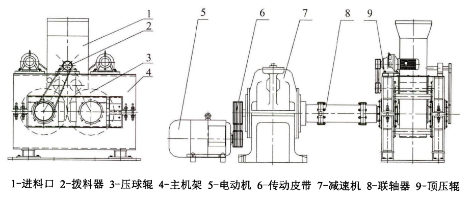 壓球機(jī)是生產(chǎn)線的關(guān)鍵設(shè)備,其主體結(jié)構(gòu)是一對相向轉(zhuǎn)動的壓輥,其中一個壓輥是固定安裝的,另一個壓輥為活動輥,通過液壓系統(tǒng)支撐在機(jī)架上,壓輥的表面有定制的模具,當(dāng)物料定量連續(xù)進(jìn)入或通過預(yù)壓機(jī)強(qiáng)制進(jìn)入壓輥中間時,物料就被壓縮成型。