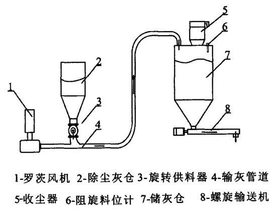 除塵系統(tǒng)手機(jī)的煙塵采用密閉管道正壓稀相輸送方式,將煙塵輸送到只求系統(tǒng)進(jìn)行壓球。采用氣力輸送的優(yōu)點是減少了煙塵的二次倒運(yùn)和因此產(chǎn)生的無組織排放,實現(xiàn)了煙塵的長距離密閉輸送。如下圖: